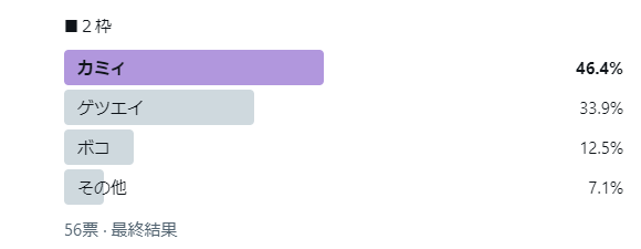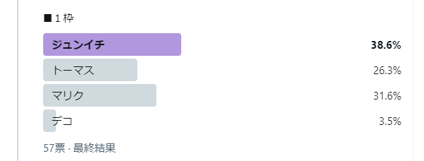 最終獲得票数カミィ 33ジュンイチ 26マリク 23ゲツエイ 20トーマス 15ボコ 7その他 7デコ 3