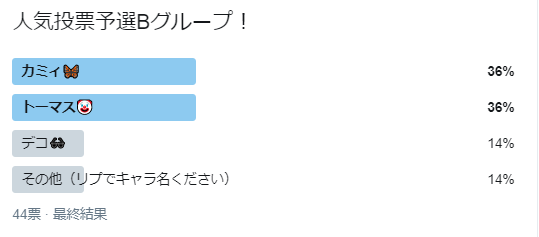 最終獲得票数カミィ 33ジュンイチ 26マリク 23ゲツエイ 20トーマス 15ボコ 7その他 7デコ 3